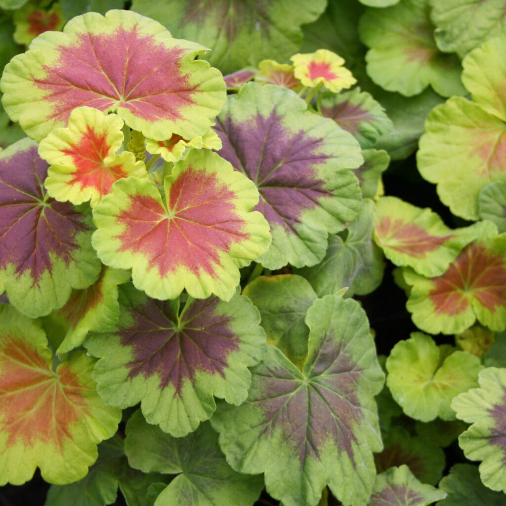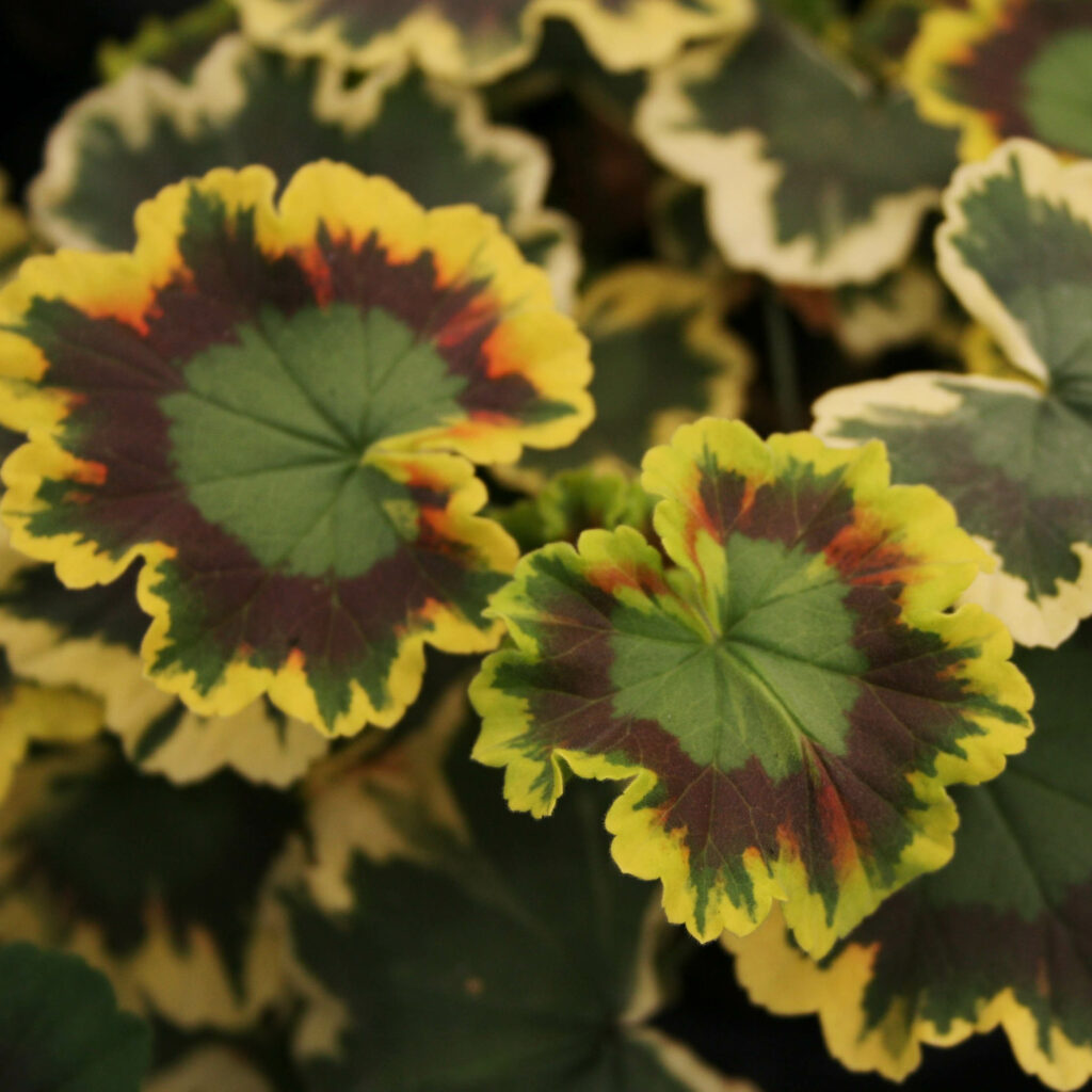 Geranium Brocades are characterized by its large, showy foliage that comes in a variety of rich, deep colors with circular, zonal bands. The plant is known for its deer resistance and attracts pollinators like butterflies and hummingbirds. It thrives in full sun to part shade and prefers rich, well-draining soil. Proper care includes regular watering, fertilization in spring, and deadheading to encourage more blooms.