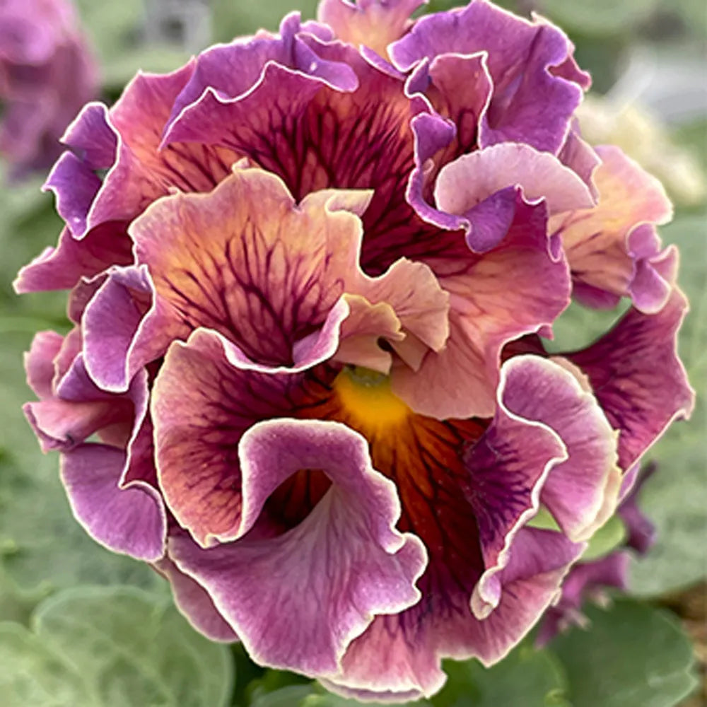 Pansy Elegance is a premium series from Japanese breeder Isao Sato, featuring large, uniquely ruffled, double flowers in two distinct collections: the soft, pastel Antoinette (pinks, yellows, whites) and the rich, deep-toned Twilight (blues, reds, wines), both offering vibrant colors and elegant textures for cool-season gardens, thriving in fall and spring.