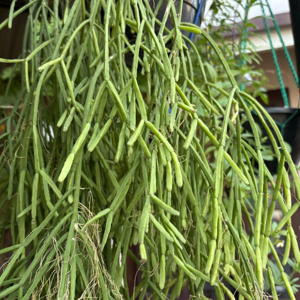 The Rhipsalis Mistletoe Cactus, also known as the Mistletoe Cactus, is an epiphytic cactus native to Central and South America, the Caribbean, and Florida. It features slender, trailing, branched stems that can reach lengths of up to 30 feet in its natural habitat but typically grow up to 6 feet tall and 2 feet wide as houseplants. The cactus produces solitary, funnel-shaped flowers that are white or greenish-white and appear in late winter to early spring. The fruits are small, spherical berries that resemble mistletoe berries. This cactus thrives in bright, indirect light, high humidity, and slightly acidic, moist, well-drained, gritty potting mix. It is low-maintenance and can be placed outdoors during the summer in partial shade to encourage flowering. The Mistletoe Cactus is also known for its resilience and intriguing growth habit, making it a captivating subject in both horticulture and indoor plant collections.